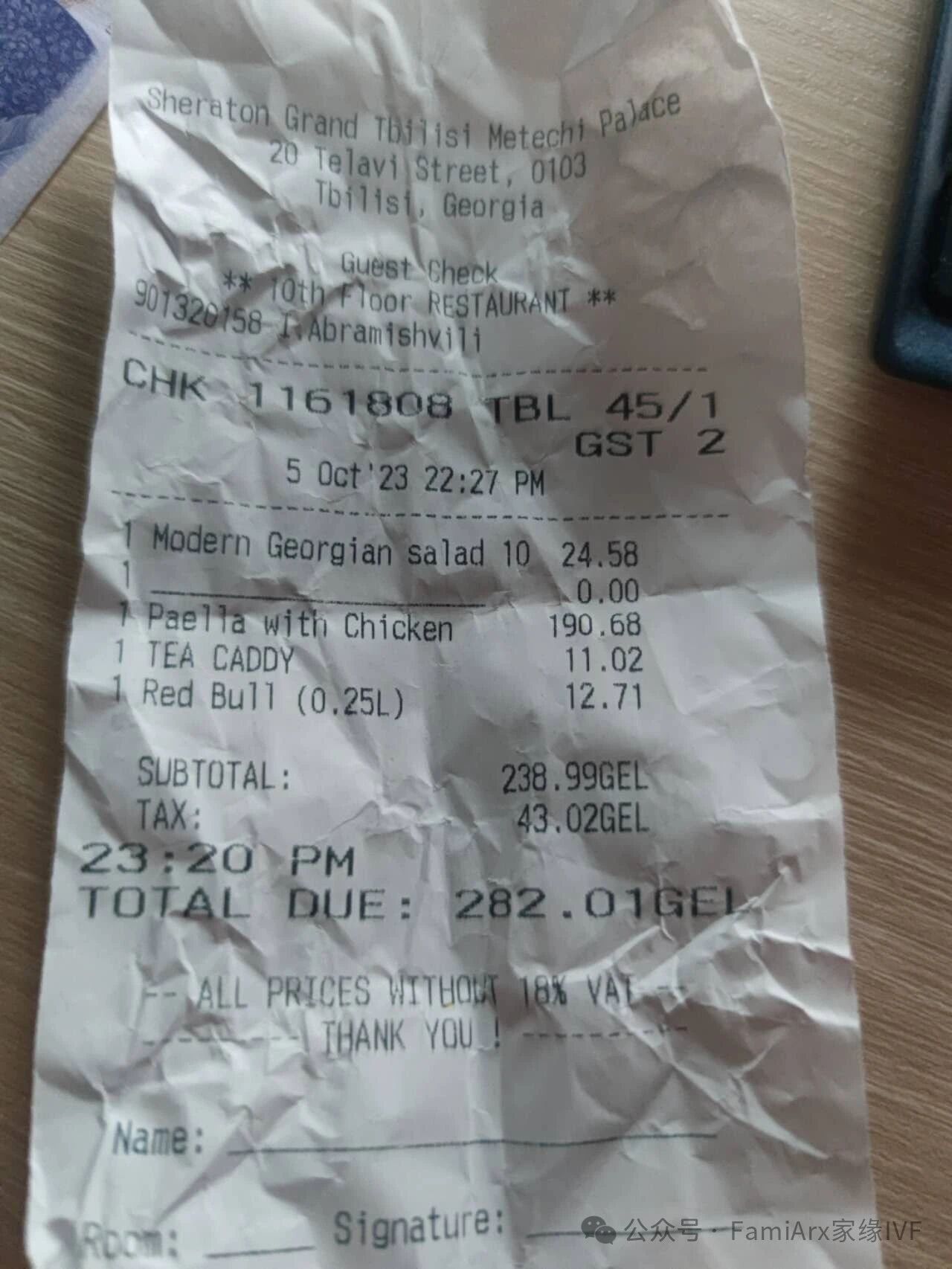 这是我第一次带她吃饭,意外地进了一个高级餐厅,一顿饭吃了我282拉里,人民币765块钱左右。但是她心情好,毕竟也快做项目了。我觉得也值。我也通过一些吃饭,一些聊天,更了解这个D妈。发票上的日期是10月5日。我还记得在这次吃饭之前几天,她说她月经突然来了,我们大晚上的去找药店买,还被坏司机宰和扔下。